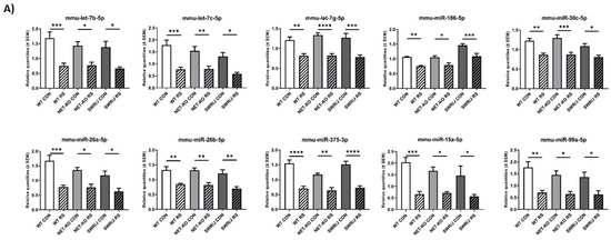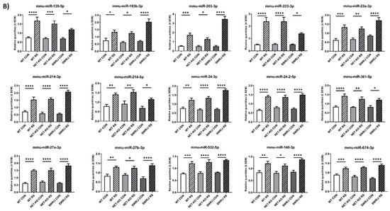 Data were further analyzed with QuantStudio 12K Flex Software (Applied Biosystems, Foster City, CA, USA). A Ct value above 30 was considered as undetectable miRNAs due to the preamplification. The same threshold equal to 0.2 was set for all samples for comparison. Then, the data were analyzed with qBasePLUS 3.1 software (Biogazelle, Gent, Belgium). The miRNAs: mmu-miR-301a-3p and mmu-miR-7a-1-3p—suitable for normalization—were generated by geNorm algorithm [42,43]. Afterwards, statistical analysis was carried out with GraphPad Prism 7.04 by two-way ANOVA to compare expression changes in each of the miRNAs between genotypes under control conditions and following RS. The Tukey’s post-test was used for multiple comparisons between groups. A value of p ≤ 0.05 was considered to be significant.