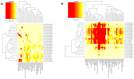 The relationship of miRNAs with Kyoto Encyclopedia of Genes and Genomes (KEGG) pathways (A) or Gene Ontology (GO) annotations (B). The heatmaps present links of miRNAs (placed on the right side) with KEGG pathways or GO annotations (placed at the bottom of the heatmaps). The miRNAs clusters were marked on the left side of the heatmaps, while KEGG pathway or GO annotation clusters—at the top of the heatmaps. The significance of linking miRNAs to KEGG pathways or GO annotations is color-coded (the scale in the upper, left corner).