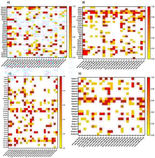 To find the target mRNAs for the miRNAs indicated by above analyses, the miRWalk platform was employed. This analysis indicated that miRNAs under study are involved in one way or another with regulation of 16,573 different mRNAs. Many miRNAs had the same mRNA target, which allowed for some groups of regulated mRNAs to be presented as the heatmaps (Figure 3). The strength of probability of miRNA–mRNA interaction was shown as the p value on the heatmap. The higher p value indicated the greater probability of specific mRNA regulation by miRNA. The highest p value was equal to 1, while the lowest one—selected during analysis—was equal to 0.9. Additionally, the results of the analysis are available in Supplementary Materials (Table S5). The selected mRNAs were divided into four groups, encoding the following: receptors of some monoamines and their transporters (Figure 3A), neurotrophic factors, neuropeptides and their receptors together with glucocorticoid receptors (Figure 3B), glutamate receptors and transporters (Figure 3C), gamma-aminobutyric acid (GABA) receptors and transporters (Figure 3D). In detail, these groups contain adrenergic, serotonin and dopamine receptors and transporters, the brain-derived neurotrophic factor (Bdnf), cerebral dopamine neurotrophic factor (Cdnf), neuron-derived neurotrophic factor (Ndnf), and nerve growth factor (Ngf) appeared among the neurotrophins, together with cyclic AMP response element binding-protein (Creb)—mediator of neurotrophin response. In turn, mRNA encoding neuropeptides such as neuropeptide Y (Npy), corticotropin-releasing hormone (Crh) receptors and urocortins (Ucn) are also regulated by the identified miRNAs as well as the mRNA encoding glucocorticoid (Nr3c1) and mineralocorticoid (Nr3c2) receptors. Additionally, ionotropic and metabotropic glutamate receptors could be found in the group in Figure 3C. Additionally, the mRNA-encoding enzymes involved in the synthesis and catabolism of glutamate as well as catalyzing synthesis and conversion of dopamine were also found to be regulated by miRNAs altered by RS in all three genotypes of mice, and were placed on the heatmaps.