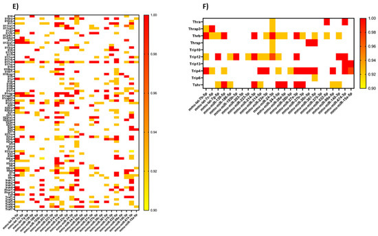 Additionally, the two other interesting groups were identified. One of them contains interleukins and tumor necrosis factor together with the receptors as well as interferon receptors (Figure 3E). The mRNA-encoding interleukin-1 (Il1) and interleukin-6 (Il6) as well as their receptors can be found on this heatmap and kinases associated with the Il-1 signaling pathway were also in this group. The other group contains thyroid hormone receptors (Figure 3F), since the analysis indicated that the mRNA encoding thyroid stimulating hormone (Tsh) receptor can be regulated by the identified miRNAs.