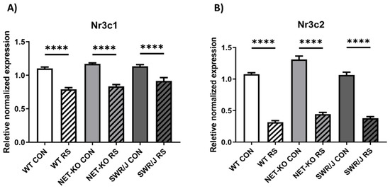 The expression of mRNA encoding the genes regulated by tested miRNAs in the liver of three genotypes (WT, NET-KO, SWR/J) of mice under the control condition (CON) and following stress (RS). Nuclear receptor subfamily 3, group C, member 1; glucocorticoid receptors (Nr3c1; (A)); nuclear receptor subfamily 3, group C, member 2; mineralocorticoid receptors (Nr3c2; (B)). **** p < 0.0001; n = 4. The significant statistical differences not marked on the graphs: A) WT CON vs. NET-KO RS p < 0.0001; WT CON vs. SWR/J RS p ≤ 0.001; NET-KO CON vs. WT RS p < 0.0001; NET-KO CON vs. SWR/J RS p < 0.0001; SWR/J CON vs. WT RS p < 0.0001; SWR/J CON vs. NET-KO RS p < 0.0001; WT RS vs. SWR/J RS p ≤ 0.05; B) WT CON vs. NET-KO CON p ≤ 0.001; WT CON vs. NET-KO RS p < 0.0001; WT CON vs. SWR/J RS p < 0.0001; NET-KO CON vs. SWR/J CON p ≤ 0.001; NET-KO CON vs. WT RS p < 0.0001; NET-KO CON vs. SWR/J RS p < 0.0001; SWR/J CON vs. WT RS p < 0.0001; SWR/J CON vs. NET-KO RS p < 0.0001.