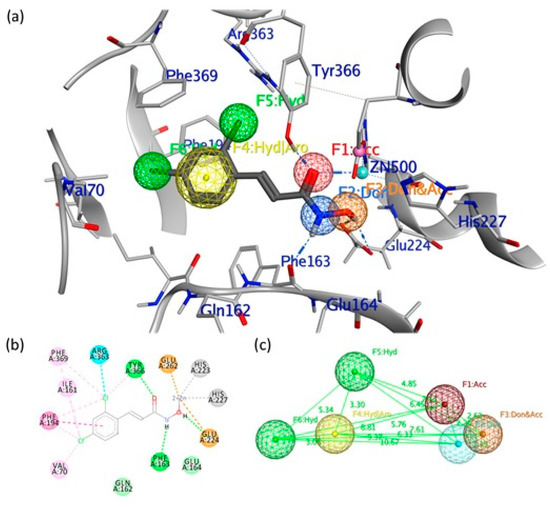 In particular, the pharmacophoric model obtained for the crystallized ligand includes the following characteristics: the hydroxamic portion, represented by two H bond donors (Don) and an H bond acceptor (Acc), while in the aromatic portion, there is a hydrophobic/aromatic center (Hyd/Aro) and two hydrophobic interactions (Hyd). The essential characteristics of the generated pharmacophore model included two hydrogen bond donors (pharmacophore areas F2 and F3, Figure 1) located in an opportune position to interact with residues Phe163 and Glu224, respectively; one hydrogen bond acceptor feature (pharmacophore area F1, Figure 1) that is positioned to interact with Tyr366 residue; one aromatic/hydrophobic center feature (pharmacophore area F4, Figure 1); and two hydrophobic points (pharmacophore areas F5 and F6, Figure 1) that are associated with the interactions of the phenyl group of the inhibitor situated in the hydrophobic pocket. The aromatic/hydrophobic region of the inhibitor is located at a distance of 6.33 Å from the hydrophilic center (hydroxamic group). At the same time, the stereo-electronic characteristics of the generated pharmacophoric model are fundamental for the search for selective inhibitors for the active site of LC/A.