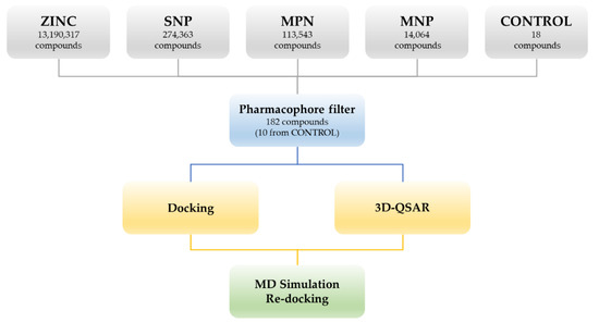 The 182 structures filtered and selected according to the pharmacophore descriptors (10 come from the CONTROL dataset) were used to perform docking studies and 3D-QSAR analysis (Tables S1 and S2). The workflow of the adopted molecular modeling procedure is reported in Figure 2.