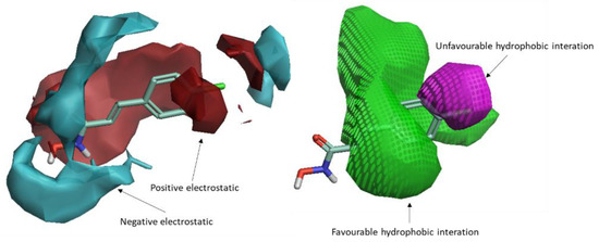 The 3D-QSAR model map is superimposed to 4-chlorocinnamic hydroxamate (originally used as a reference compound for the alignment). The positive field regions are red, and the negative ones are blue. Favorable shape/hydrophobic regions are green, and unfavorable shape/hydrophobic regions are violet.