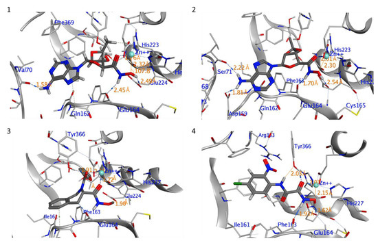 The ten compounds with the best-predicted mean activity resulting from both 3D-QSAR and docking methodologies are reported in Table 1, excluding those belonging to the control dataset, together with the mean of the predicted pIC50 and pKi values. Interestingly, among the different series, there are three diastereoisomers (compounds 1, 2, and 7), while compound 4 is structurally similar to crystallized hydroxamate inhibitors. All compounds have a mean predicted value (used as a consensus score of the combined screening approach) between 6.2 and 6.5, and the 3D representations of the best-docked poses of the first four compounds are depicted in Figure 4.