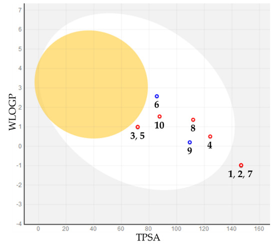 BOILED-Egg plot. Points located in the BOILED-Egg’s yolk (yellow) represent the molecules predicted to passively permeate through the blood–brain barrier, whereas those in the egg white are relative to the molecules predicted to be passively absorbed by the gastrointestinal tract; the blue dots indicate the molecules that were expected to be effluated from the central nervous system (CNS) by P-glycoprotein, whereas the red ones represent the molecules predicted not to be effluated from the CNS by P-glycoprotein.