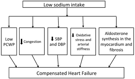Figure 1 shows potential mechanisms of benefit with low sodium intake in patients with HF. A low sodium diet is shown to be associated with decreased pulmonary artery and capillary wedge pressures in patients with New York Heart Association (NYHA) Class III to IV heart failure [27]. Previous studies have shown that HF patients have systemic inflammation characterized by increased levels of tumor necrosis factor (TNF)-alpha, interleukin (IL)-1B and IL-6, chemokine (monocytes chemoattractant protein-1 and IL-8), as well as enhanced expression of adhesion molecules. Moderate sodium restriction (up to 2.8 g/d) was associated with reduced values of neurohormonal (B-type natriuretic peptide (BNP), aldosterone, plasma renin activity) and cytokine levels (TNF-alpha, IL-6) and increased levels of anti-inflammatory cytokine (IL-10) over 12 months of follow up compared to low sodium restriction (up to 1.8 g/d) [28]. A recent review of the effects of low dietary sodium intake in patients with HF revealed that 2.6–3 g/d of dietary sodium restriction is effective for decreased BNP, renin, and aldosterone plasma levels [29]. Similarly, low sodium intake in the DASH diet is associated with low systolic and diastolic blood pressure, arterial stiffness, and markers of oxidative stress including urinary F2-isiprostane levels in HFpEF patients [30]. Adherence to the DASH diet was shown to be associated with improvement in arterial compliance, improved exercise capacity, and quality of life in patients with stage C HF [31].