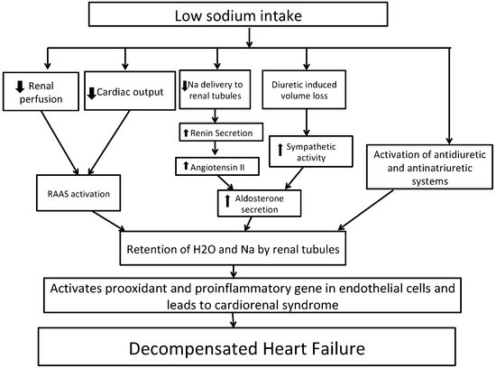 Figure 2 shows the potential mechanism for decompensated HF with low sodium intake. In short, HF is characterized by activation of the sympathetic system and renin–angiotensin–aldosterone system (RAAS) activation due to decreased renal perfusion leading to sodium and water reabsorption from renal tubules [40,41]. A sodium-restricted diet in HF patients has been shown to be associated with activation of antidiuretic and anti-natriuretic systems [42]. A recent Cochrane review of 185 clinical studies randomizing persons to low- vs. high-sodium diet revealed that in plasma or serum, there was a statistically significant increase in renin, aldosterone, noradrenaline, adrenaline, cholesterol, and triglyceride levels in groups with low sodium intake as compared to groups with high sodium intake [43]. These increases in hormones can lead to further development of congestive symptoms. Vascular congestion in HF activates pro-oxidant and pro-inflammatory genes in endothelial cells, which contributes to cardiorenal dysfunction [44,45,46]. Reduced sodium intake can lower blood pressure, which in turn can increase the heart rate and thereby negate the effects of beta-blockers. This was shown in a recent meta-analysis of 63 studies, although the effect was marginal with a heart rate increase of as little as 2.4% [47]. Reverse causation could also explain the observed association of lower sodium intake and outcomes. Higher-risk individuals with HF might consume less sodium due to their underlying illness but still have higher risks of adverse events.