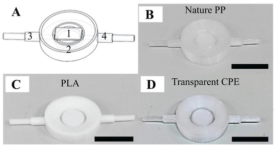The performance of the 3D-printed fluid cell: (A) blueprint of the fluid cell: part (1) a glass substrate placed on top of the sample substrate holder, part (2) the ring of the fluid cell, and parts (3–4) two symmetrical pipes, and (B,C,D) fluid cell products involving nature polypropylene (PP), polylactic acid (PLA), and transparent copolyester (CPE), respectively. The scale bar is 1 cm.