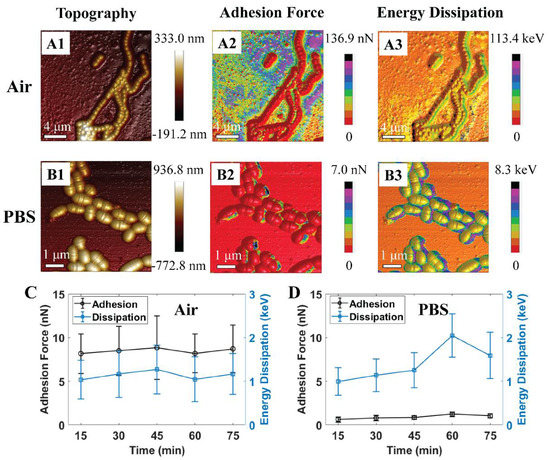 Schematic illustrations of 3D atomic force microscopy (AFM) morphologies of S. mutans biofilm at initial treatment in (A1–A3) air and (B1–B3) phosphate-buffered saline (PBS). Graphs of quantitative adhesion force and energy dissipation of S. mutans treated in (C) air (n = 57) and (D) PBS (n = 12).