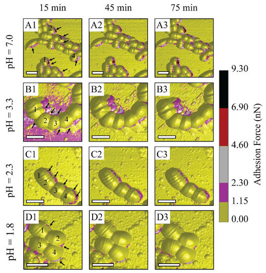 Figure 3 suggests that bacterium metabolic activities might be inhibited at low pH levels of 2.3 and 1.8, which corresponds to the reduction in the number of high adhesion zones and adhesion values. The metabolic activities might be reflected through EPS discharge phenomena, since EPS is a key to maintain low bacterial sensitivity to the antibiotic [10,42]. Accordingly, a further measurement of the metabolic activities of S. mutans is needed to confirm our hypothesis. Under the PBS condition, there were numerous adhesion zones at bacterium inter-cell and rim areas, labeled with arrows (see Figure 3(A1–A3)). During this treatment, there were no remarkable changes in the substrate around the bacterium cells. This indicates that PBS is an environment that can maintain S. mutans survival. In other words, citrate and hydrogen ions dissociated from citric acid are transported and metabolized through cell membranes. At pH 3.3, numerous high adhesion zones were seen at inter-cell areas and even large areas surrounding bacterial rims, labeled with arrows (see Figure 3(B1–B3)). The number of these zones was reduced at pH level 2.3 and was vigorously lower at pH 1.8. However, numerous adhesion zones were still observed along the bacterium rim at pH 2.3 (see Figure 3(C1–C3)). Citric acid pH 1.8 tended to inhibit the metabolic activities of bacteria due to a significantly low number of narrow discharge zones (see Figure 3(D1–D3)). This was also due to the greatly reduced adhesion forces of S. mutans compared to those of the control PBS, and pH levels of 3.3 and 2.3. This suggests that the metabolic activities of S. mutans become ineffective at citric acid pH 1.8.