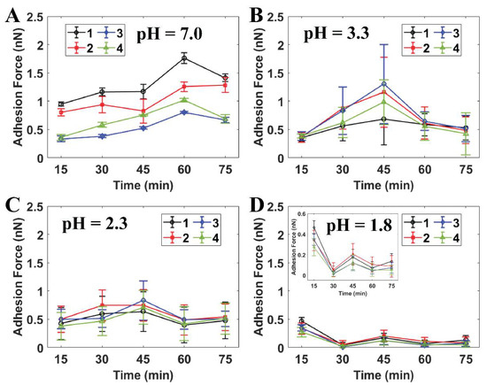 Quantitative adhesion forces of four individual S. mutans cells measured by AFM at (A) PBS pH 7.0, (B) citric acid pH 3.3 (n = 20), (C) citric acid pH 2.3 (n = 50), and (D) citric acid pH 1.8 (n = 50). Note: Cells 1–4 are labeled as individual cells in Figure 3.