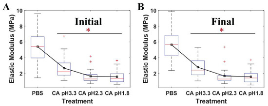 The quantitative elastic modulus of four individual S. mutans cells measured by AFM at (A) the initial stage and (B) the final stage under PBS pH 7 (n = 36), citric acid (CA) pH 3.3 (n = 30), citric acid 2.3 (n = 30), and citric acid 1.8 (n = 30). * Value was statistically significant among the elastic moduli of S. mutans treated in PBS and low pH citric acid environments, p < 0.001.