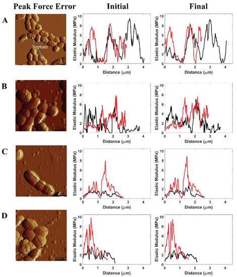 Illustrated AFM phase image and cross-sectional profile of the modulus of S. mutans measured in (A) PBS pH 7, (B) citric acid pH 3.3, (C) citric acid pH 2.3, and (D) citric acid pH 1.8 at the initial stage and the final stage of AFM experiments.