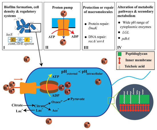 - Cotter, P.D.; Hill, C. Surviving the acid test: Responses of gram-positive bacteria to low pH. Microbiol. Mol. Biol. Rev. 2003, 67, 429–453. [Google Scholar] [CrossRef]
