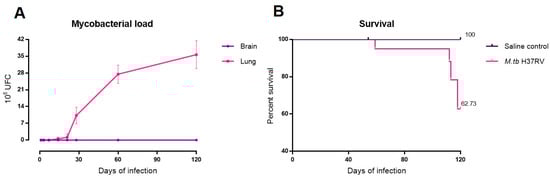 Mycobacterial loads in brain and lung and survival rate of BALB/c mice infected with 2.5 × 105 colony-forming unit (CFU) of M. tb H37Rv. (A) Comparative quantification of CFU from lungs and brains of infected mice at each time of infection (n = 12). No bacilli loads were detected in the brain homogenates from mice infected with the H37Rv strain. (B) Survival rates of mice injected with saline solution (control) or infected with M. tb H37Rv (M. tb H37Rv) (n = 36). After two months of infection, infected mice started to die.