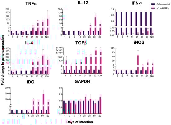Cytokine and enzyme expression of the cerebellum of mice intratracheal infected with M. tb H37Rv. In the absence of any detectable brain infection, there was a significant increase in gene expression from day 1 post-infection with a peak on days 60 and 120. Saline controls were mainly unaffected. RNA was isolated from cerebellum homogenates and reverse-transcribed to cDNA, then analysed for changes in gene expression determined by RT-PCR of the indicated cytokine or enzyme. Fold-change values were normalised to expression levels of the saline controls. Data are expressed as mean ± SEM. TNFα F (1, 10) = 68.02, p < 0.001, two-way ANOVA; *** p < 0.0001 Sidak’s multiple comparisons test (α = 0.05) (n = 6). IL-12 F (1, 10) = 77.4, p = 0.0028, two-way ANOVA; *** p < 0.0001, Sidak’s multiple comparisons test (α = 0.05) (n = 6). IFNγ F (1, 10) = 48.96, p < 0.0001, two-way ANOVA; * p < 0.01, ** p < 0.001, *** p < 0.0001, Sidak’s multiple comparisons test (α = 0.05) (n = 6). IL-4 F (1, 10) = 85.23, p < 0.001, two-way ANOVA; * p < 0.01, ** p < 0.001, *** p < 0.0001, Sidak’s multiple comparisons test (α = 0.05) (n = 6). TGFβ F (1, 10) = 54.36, p < 0.001, two-way ANOVA; * p < 0.019, *** p < 0.0001, Sidak’s multiple comparisons test (α = 0.05) (n = 6). IL-10 F (1, 10) = 91.23, p < 0.0001, two-way ANOVA; *** p < 0.0001, Sidak’s multiple comparisons test (α = 0.05) (n = 6). iNOS F (1, 10) = 45.23, p < 0.0001, two-way ANOVA; * p < 0.01, *** p < 0.0001, Sidak’s multiple comparisons test (α = 0.05) (n = 6). IDO F (1, 10) = 76.4, p < 0.0001, two-way ANOVA; * p < 0.01, ** p < 0.001, *** p < 0.0001, Sidak’s multiple comparisons test (α = 0.05) (n = 6).