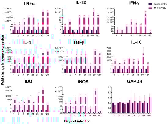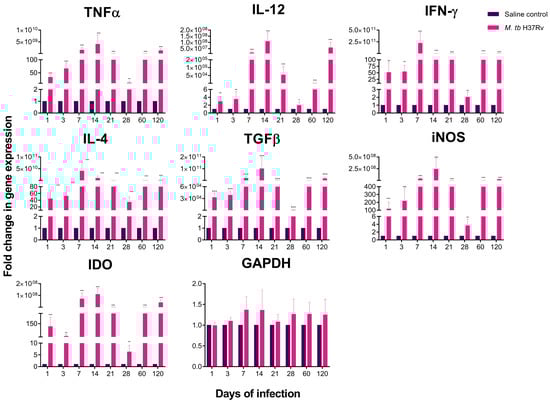 Cytokine and enzyme expression of the hippocampus of mice intratracheal infected with M. tb H37Rv. In the absence of any detectable brain infection, there was a significant increase in gene expression from day 1 post-infection, being the highest on days 7 and 14 post-infection. Saline controls were mainly unaffected. RNA was isolated from hippocampus homogenates and reverse-transcribed to cDNA, then analysed for changes in gene expression determined by RT-PCR of the indicated cytokine or enzyme. Fold-change values were normalised to expression levels of the saline controls. Data are expressed as mean ± SEM. TNFα F (1, 10) = 81.02, p < 0.0001, two-way ANOVA; ** p < 0.001, *** p < 0.0001 Sidak’s multiple comparisons test (α = 0.05) (n = 6). IL-12 F (1, 10) = 59.7, p = 0.0032, two-way ANOVA; * p < 0.018, ** p < 0.001, *** p < 0.0001, Sidak’s multiple comparisons test (α = 0.05) (n = 6). IFNγ F (1, 10) = 83.6, p < 0.0001, two-way ANOVA; * p < 0.01, ** p < 0.001, *** p < 0.0001, Sidak’s multiple comparisons test (α = 0.05) (n = 6). IL-4 F (1, 10) = 79.3, p < 0.001, two-way ANOVA; *** p < 0.0001, Sidak’s multiple comparisons test (α = 0.05) (n = 6). TGFβ F (1, 10) = 82.7, p < 0.0001, two-way ANOVA; *** p < 0.0001, Sidak’s multiple comparisons test (α = 0.05) (n = 6). iNOS F (1, 10) = 94.32, p < 0.0001, two-way ANOVA; ** p < 0.0016, *** p < 0.0001, Sidak’s multiple comparisons test (α = 0.05) (n = 6). IDO F (1, 10) = 89.45, p < 0.0001, two-way ANOVA; ** p < 0.001, *** p < 0.0001, Sidak’s multiple comparisons test (α = 0.05) (n = 6).