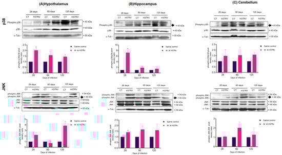 The mitogen-activated protein kinase (MAPK) cascades are intracellular signal transduction pathways that are evolutionarily conserved. These pathways respond to numerous external stimuli and regulate cellular mechanisms related to stress response and inflammation, among others. The role of MAPKs in inflammation is primarily related to the control of cytokine expression [24] and cell death. MAPK cascade comprises extracellular signal-regulated kinase (ERK) 1/2, c-Jun NH2-terminal kinase (JNK), and p38 [25]. The JNK family participates in neuroinflammation, neurodegeneration and kainate-induced excitotoxicity by regulating the expression of pro-inflammatory cytokines (TNFα, IL-2) and the decline of trophic molecules [26]. Another member of the MAPK cascades is p38; a serine kinase involved in mechanisms related to inflammatory responses, such as induced by oxidative stress and pro-inflammatory cytokines (TNFα, IL-1β) [27]. Due to the increase in pro-inflammatory cytokines and neuronal damage in the hippocampus, hypothalamus and cerebellum of tuberculous animals, we studied the JNK and p38 activation by the expression of both proteins in their phosphorylated form in the selected brain regions by Western blot on days 28, 60 and 120 post-infection.