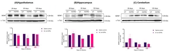 Production of BDNF in the hypothalamus (A), hippocampus (B) and cerebellum (C) of mice with pulmonary tuberculosis (TB). Upper panel shows a representative image of the Western blot at 28, 60 and 120 days post-infection. Lower panel shows the quantification of the PD ratio. BDNF levels decreased in the hippocampus and the hypothalamus at 60 days post-infection and in the cerebellum at 120 days post-infection. Data are expressed as mean ± SEM. Hypothalamus 60 days t = 3.025, * p = 0.0186, two-tail, unpaired t-test. Hippocampus 60 days t = 4.025, * p = 0.0276, two-tail, unpaired t-test. Cerebellum 120 days t = 9.391, ** p = 0.0026. (n = 3).