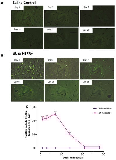 Pulmonary infection with M. tb induced neuronal injury in the hippocampus (CA3) at the early phase of infection. (A) Representative images of the Fluoro-Jade B (FJ-B) staining in CA3 in the saline control and tuberculous mice (B) at different time points after M. tb infection. (C) Quantification of positive cells to FJ-B in the hippocampus at the indicated days post-infection. Only infected pulmonary animals showed positive cells to FJ-B during the first and second week. Data are expressed as mean ± SEM. F (1, 6) = 2360, p < 0.0001, two-way ANOVA; **** p < 0.0001, Sidak’s multiple comparisons test (α = 0.05) (n = 6).