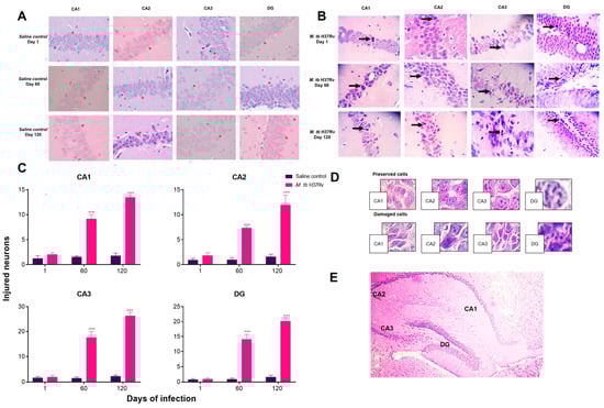 Pulmonary infection with M. tb induced neuronal death in the hippocampus in the late phase of infection. Representative image of the saline group (A) and tuberculous mice (B) with H&E staining (40×). The asterisks (*) in 8A show preserved hippocampal cells. Arrows indicate damaged cells. (C) The percentage of cells injured per field. (D) The criteria used to discriminate damaged cells from healthy cells. (E) A coronal section of the mice brain, indicating the hippocampus areas from where the fields were obtained for quantification. The infected mice presented a critical number of injured cells in the hippocampus, mostly in the CA3 region and in the DG in contrast to the saline group. Data are expressed as mean ± SEM. CA1 F (1, 10) = 218.6, p < 0.0001, two-way ANOVA; **** p < 0.0001, Sidak’s multiple comparisons test (α = 0.05) (n = 6). CA2 F (1, 10) = 49.01, p < 0.0001, two-way ANOVA; **** p < 0.0001, Sidak’s multiple comparisons test (α = 0.05) (n = 6). CA3 F (1, 10) = 268.3, p < 0.0001, two-way ANOVA; **** p < 0.0001, Sidak’s multiple comparisons test (α = 0.05) (n = 6). DG F (1, 10) = 106.9, p < 0.0001, two-way ANOVA; **** p < 0.0001, Sidak’s multiple comparisons test (α = 0.05) (n = 6).