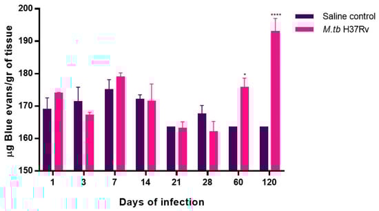 Inflammation induces BBB damage due to the increase in pro-inflammatory cytokines [30]. Thus, the permeability of the BBB was determined in tuberculous animals using the Evans Blue (EB) dye. There was a significant increase in the BBB permeability at days 60 and 120 post-infection (Figure 9).