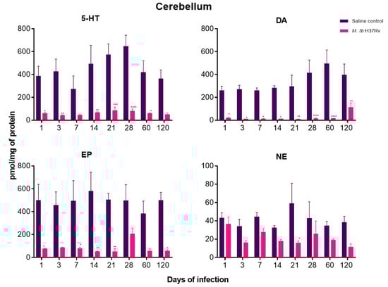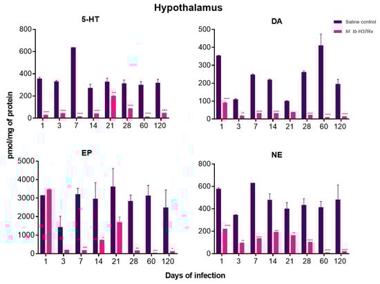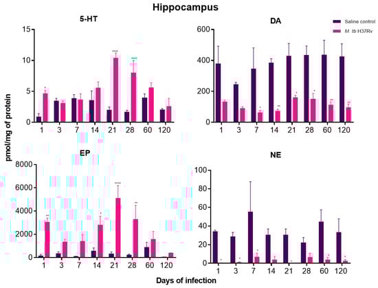 DA and NE decreased in the hippocampus during the whole course of pulmonary TB. At the same time, EP concentrations showed a significant increase from day one of infection, raising its peak at day 21 when in this TB model there is the maximal immune protection manifested by well-formed pulmonary granulomas with high production of IFN-γ and TNF-α, as well as activation of HPA axis [10,31,33]. Interestingly, the concentration of NE was significantly lower at day 120 of infection when in this model, where there is the highest pulmonary bacillary burdens and extension of pneumonia [10]. Contrary to the hypothalamus and cerebellum, the hippocampus did not show a decrease in serotonin levels (Figure 12).