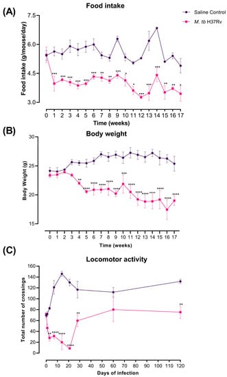 Sickness behaviour showed by TB mice. (A) Food intake, (B) body weight loss and (C) locomotor activity (LMA). Infected animals showed food intake decrease after one week of infection, Body weight starts decreasing after three weeks post-infection, and the locomotor activity was decreased during the whole course of the disease being most pronounced during early infection from day 1 to 21. Data are expressed as mean ± SEM. Food intake F (1, 10) = 51.86, p < 0.0001, two-way ANOVA; * p < 0.01, ** p < 0.001, *** p < 0.0005, Sidak’s multiple comparisons test (α = 0.05) (n = 6). Body weight loss F (1, 3) = 101.2, p = 0.0021, two-way ANOVA; ** p < 0.001, *** p < 0.0002, **** p < 0.0001, Sidak’s multiple comparisons test (α = 0.05) (n = 6). LMA F (1, 4) = 222.9, p = 0.0001, two-way ANOVA; ** p < 0.001, **** p < 0.0001, Sidak’s multiple comparisons test (α = 0.05) (n = 6).