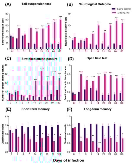 Behaviour abnormalities showed by pulmonary TB mice. (A) Tail suspension test (depression-like behaviour), (B) neurological outcome, (C) stretched attend posture (anxiety-like behaviour), (D) open field test (unconditioned fear and anxiety), (E) short-term and (F) long-term memory. Animals infected with M. tb in the lungs present behavioural abnormalities such as depression-like behaviour, anxiety-like behaviour, neurological damage, and short- and long-term memory damage. Data are expressed as mean ± SEM. Tail suspension test F (1, 4) = 225.2, p = 0.0001, two-way ANOVA; *** p < 0.0001, Sidak’s multiple comparisons test (α = 0.05) (n = 6). Neurological outcome F (1, 4) = 186.3, p = 0.0002, two-way ANOVA; ** p < 0.001, *** p < 0.0001, Sidak’s multiple comparisons test (α = 0.05) (n = 6). Stretched attend posture F (1, 4) = 166, p = 0.0002, two-way ANOVA; *** p < 0.0001, Sidak’s multiple comparisons test (α = 0.05) (n = 6). Open field test F (1, 6) = 326.5, p < 0.0001, two-way ANOVA; * p < 0.01, *** p < 0.0001, Sidak’s multiple comparisons test (α = 0.05) (n = 6). Short-term memory F (1, 4) = 49.05, p = 0.0022, two-way ANOVA; * p < 0.01, ** p < 0.001, Sidak’s multiple comparisons test (α = 0.05) (n = 6). Long-term memory F (1, 4) = 116, p = 0.0004, two-way ANOVA; * p < 0.01, ** p < 0.001, *** p < 0.0001, Sidak’s multiple comparisons test (α = 0.05) (n = 6).
