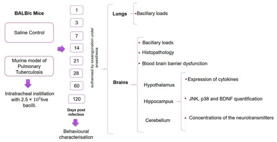 Study design workflow. BALB/c mice, 8 weeks of age, were infected with 2.5 × 105 live bacilli or received saline solution (control). At days 1, 3, 7, 14, 21, 28, 60 and 120 post-infection, different behavioural tests were performed. After the behavioural tests, animals were euthanised, and the brain and lungs were collected for the determination of bacillary loads. The hypothalamus, hippocampus and cerebellum were used to determinate the cytokines gene expression, JNK, p38 and BDNF quantification and the determination of neurotransmitters levels. In brains, histological damage and the permeability of the blood–brain barrier were also measured. For each of the measurements, except for the Western Blot, two independent experiments were performed with n = 3 each. The samples for each experimental age group were run separately.