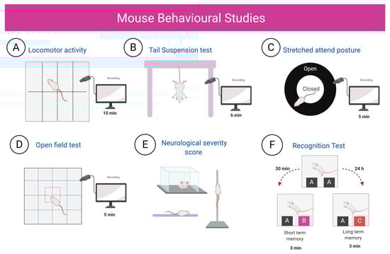 Schematic representation of the behavioural tests performed. Groups of mice of both experimental groups were tested only once, and the studies were performed during the first 4 h of the dark phase of the light cycle. (A) Locomotor activity. To assess LMA, the animals were placed in a box divided into 16 quadrants, and the number of crosses between quadrants were counted in 10 min. (B) Tail suspension test. In this test, the animals were suspended from the tail ventrally for 6 min, and the time that the animal presented behavioural despair was recorded. (C) Stretched attend posture. For this test, each mouse was located in the covered area of the platform and filmed for 5 min. The number of stretched attend postures was counted for 5 min. (D) Open field test, we videotaped from the top in a box divided into 16 quadrants by 5 min and evaluated the time spent in the outer area. (E) Neurological severity score. (F) Recognition test. For this test, the animals were exposed to two objects A, and 30 min after, one of these was changed for object B, whereby short-term memory was evaluated; for long-term memory, the same procedure was carried out, but after 24 h, object C was presented to the animals. (Created with BioRender.com.)