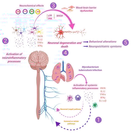 M. tb induces neuroinflammation, neuronal damage and behavioural abnormalities during pulmonary infection. TB is an infectious disease that mainly affects the lungs, although it can spread to other organs and cause extrapulmonary TB. However, most of the time, the host’s immune system efficiently controls the infection. Although, when there is some failure in the immune system, the infection becomes active. (1) Intense inflammation due to the immune response against mycobacteria in the lungs induces neuroinflammation by humoral and neuronal pathways, (2) which is manifested by high production of different cytokines, (3) which disturbs the production of neurotransmitters and induces oxidative damage, with activation of p38 and JNK and decrease in BNDF production. (4) All this causes neuronal injury and death, increases the permeability of the BBB and (5) induces behavioural alterations and neuropsychiatric symptoms such as depression and anxiety. (Created with BioRender.com.).