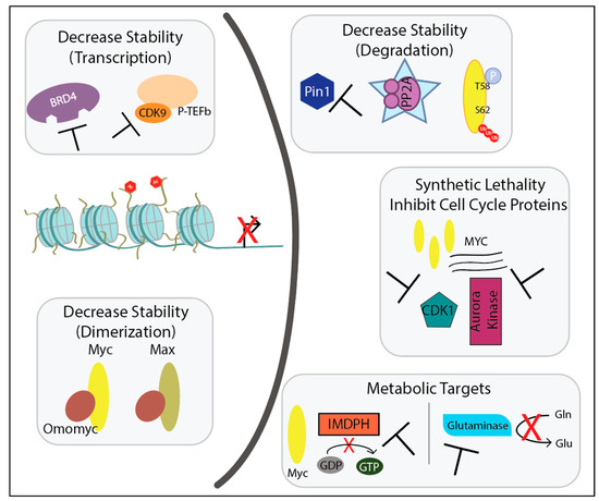 In cancer, Myc’s aberrant function as a transcription factor leads to increased cell proliferation, cell differentiation, cell adhesion, and angiogenesis [10]. Here we will focus on inhibiting transcription, disrupting Myc/Max dimerization, and enhancing protein degradation as strategies to disrupt Myc gene and protein stability and therefore Myc-driven tumorigenesis.
