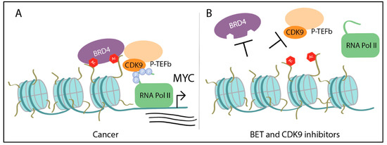 Additionally, combining CDK9 and BET inhibitors synergistically improves anti-proliferative activity in several cancers, with no hematological toxicity or weight loss shown in vivo [93,94,95]. Of the same note, BET inhibitors were also efficacious when paired with additional inhibitors, such as PI3K, ERK, or BCL2 inhibitors [81]. Readers are referred to reviews further discussing targetable Myc cofactors that aid in tumorigenesis [13], such as G quadraplex stabilizers [96,97]. In all, BET and CDK9 inhibitors vastly affect transcription and as a result, downregulate MYC expression indirectly; improving their specificity is expected to increase their therapeutic benefit.