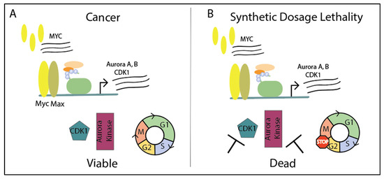 Myc also induces expression of Aurora A kinase, which reciprocally stabilizes Myc in addition to its role in cell cycle [178]. Aurora kinases A and B direct cell cycle progression through G2-M. Aurora A aids in centrosome function, spindle assembly, and mitotic entry while Aurora kinase B is the catalytic component within the chromosomal passenger protein complex (CPPC) to control chromosomal condensation and cytokinesis [179,180]. Aurora A and B kinases are overexpressed in breast and colon cancers, along with sarcoma, esophageal, and stomach cancers [181]. Myc is known to upregulate Aurora kinase A and B expression in B-cell lymphomas, which is necessary to maintain the lymphoma [182]. Similarly, overexpressing MYC in medulloblastoma cell lines with low MYC expression led to an associated increase in Aurora B expression [183]. Overall, cell cycle proteins such as Aurora kinases or CDK1 in MYC-overexpressing cells are potential therapeutic targets as inhibition leads to synthetic dosage lethality (Figure 6).