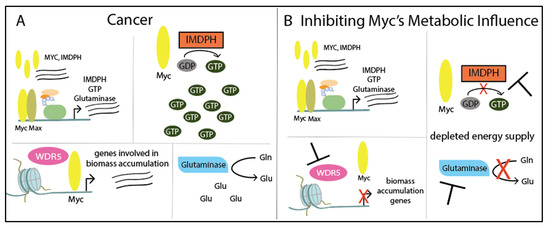 Myc influences metabolism through its target genes: (A) In cancer, MYC overexpression correlates with IMPDH expression and transcribes other target genes, including GTP and glutaminase (GLN). IMPDH catalyzes GDP to GTP and glutaminase converts glutamine (Gln) to glutamate (Glu), a major energy source in cancer. Lastly, epigenetic co-factor WDR5 recruits Myc to chromatin to express genes involved in biomass accumulation. (B) Although Myc still has control over target genes IMPDH, GTP, and GLN, the function of these proteins can be inhibited. Cancer’s energy supply can be depleted by inhibiting IMPDH, which prevents GTP production, or by inhibiting glutaminase, which will limit the pool of glutamate. Finally, inhibiting WDR5 will prevent Myc’s target gene expression of biomass related genes.