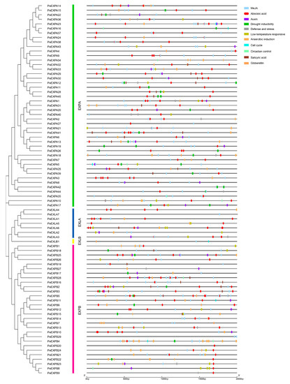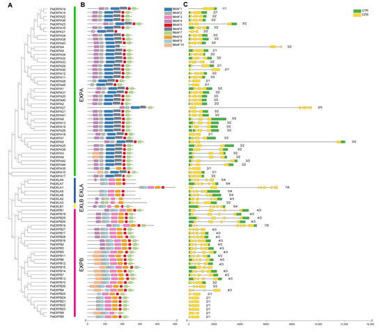In the gene family, the importance of the distribution pattern of the number of introns and exons is obvious. It is regarded as the skeleton and evolutionary fingerprint of the gene, which can be used to understand the structural evolution of the family. We provide the gene structure organization in Figure 2; most members of the same subfamily exhibited similarities in structure, showing consistency. For instance, most members (68.9%) of the EXPA subfamily contained three exons, while other members usually had two or five exons. However, the gene structure of the EXLB subfamily exhibited 5 exons and 4 introns, similar to the EXLA subfamily. The EXPB subfamily can be divided into two groups according to the number of exons: one had two exons and the other had four exons. The reason for these differences may be the loss or acquisition of exons induced by long-term evolution. In addition, there are multiple introns in the EXLA subfamily; in particular, PeEXLA1 presented the largest number of exons (six). The other genes had no significant difference, showing consistency, and each subfamily contained more than one intron. This suggested that there is a tight evolutionary relationship between members in the same subfamily.