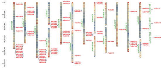 The results of chromosomal location showed that PeEXs were distributed unevenly on the scaffolds of moso bamboo, and the number of expansin genes on every putative scaffold was quite different due to the incomplete genome and low genetic variation abundance of moso bamboo. According to the chromosome mapping (Figure 3), scaffold 21 contains the largest number (13) of expansin genes, followed by scaffold 13 and scaffold 15, with 10 and 9 expansin genes, respectively. However, only one expansin gene was found on scaffold 10, scaffold 14, scaffold 18, scaffold 3160, scaffold 12,018 and scaffold 17,722. The number of expansin genes on the rest of scaffolds varied from 2 to 7. Interestingly, PeEXLB1, which was the only member of the EXLA subfamily, was located on scaffold 10. No other expansin genes can be found in this scaffold, which was unique in this result. In addition, we found the largest number of genes on scaffold 10, including 6 EXPA, 6 EXPB and 1 EXLA subfamily member(s). At the same time, tandem duplication gene pairs, which are considered to be an important driving force for the occurrence of new biological functions, existed on some scaffolds, such as PeEXPA36 and PeEXPA37, PeEXPA32 and PeEXPA33, etc. Notably, there were four pairs of tandem duplication gene pairs on scaffold 21 (Figure 3).