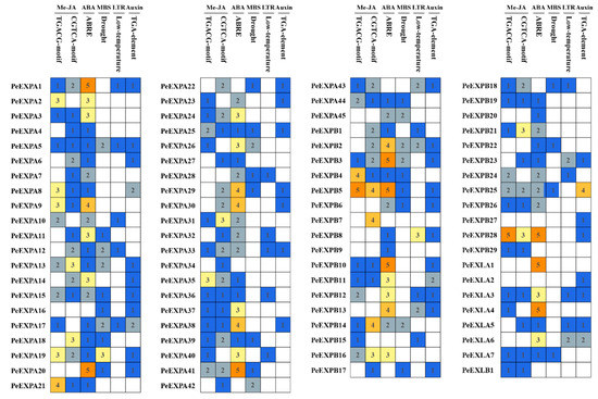 The numbers of promoter elements in the PeEXs’ promoter regions. Five major cis-elements of PeEXs are indicated by different-colored boxes with numbers.