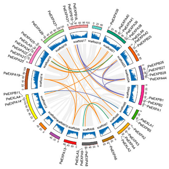 Syntenic analysis of expansin genes in moso bamboo. Different scaffolds are shown in different colors. The gene density is displayed in the form of histogram. The inner gray lines represent all the collinearity relationships in moso bamboo, and the inner orange, purple and green lines represent the collinearity relationships of EXPA, EXPB and EXLA subfamilies, respectively. A total of 31 pairs of segmented duplication genes were detected in the P. edulis genomes.