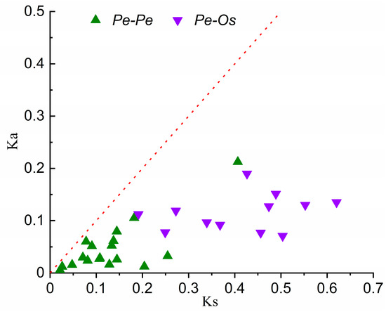Distribution of Ka and Ks from paralogous (Pe–Pe) and orthologous (Pe–Os) gene pairs. Twelve putative orthologous gene pairs (Pe–Os) and nineteen putative paralogous gene pairs (Pe–Pe) are displayed in different colors and shapes, and the red dashed line indicates the slope of Ka/Ks = 1.