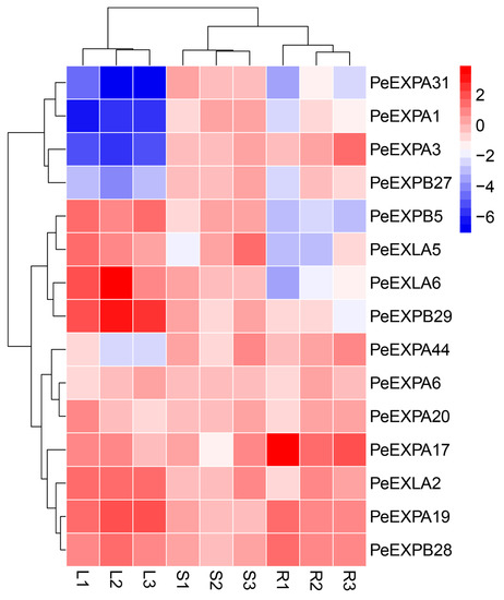 Expression pattern of 15 selected PeEXs in different tissues. The heat map was drawn using log2 logarithmic transformed expression values. Red and blue represent high and low expression levels, respectively. Based on the expression, the expansin genes were hierarchically clustered and divided into various gene clusters in the figure. L, leaves; S, stems; R, roots; 1, 2 and 3 represent the three biological replicates. Three repetitions were used to reduce technical errors when performing qRT-PCR.