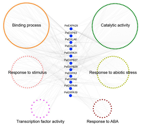 In this study, we reconstructed the co-expression regulatory network of 11 selected genes using the BambooNET online database (Figure 10). There were 366 nodes and 448 connections in the co-expression network. The GO annotation classification results showed that the majority of the co-expressed genes were enriched in biological pathways, such as binding process (116 edges), catalytic activity (103 edges), biological regulation (16 edges), stimulus response (98 edges), abiotic stress response (89 edges) and ABA response (26 edges), which implied an important function of expansins in response to stimuli and abiotic stresses in plants. Among them, PeEXPB29 has 79 nodes, which is the largest module in the network, including 16 nodes involving binding processes, 28 nodes involving catalytic activity, 10 nodes involving stimulus response, 16 nodes involving abiotic stress response and 9 nodes involving transcription factor activity. PeEXPA31, PeEXPB29 and PeEXPA6 were distinctly closely connected with genes related to abiotic stress response. PeEXPA19 had the most nodes related to ABA response, which also echoed the above results.