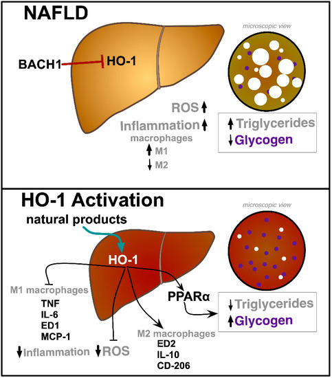 Schematic diagram on the potential role of natural product HO-1 inducers in NAFLD. In NAFLD, HO-1 levels are suppressed by several mechanisms, including increased BACH1 activity. This increases reactive oxygen species (ROS) levels as well as macrophage M1 polarization as opposed to M2, both of which contribute to increasing triglyceride accumulation and reductions in glycogen content. Natural product induction of HO-1 decreases M1 macrophage levels and their resultant inflammatory cytokines, including tumor necrosis factor (TNF), interleukin-6 (IL-6), cluster of differentiation 68 (ED1), monocyte chemoattractant protein-1 (MCP-1), and at the same time increases M2 macrophage levels and their resultant anti-inflammatory cytokines, ED2, interleukin-10 (IL-10), and mannose receptor (CD-206). HO-1 also increases the activity of peroxisome proliferator-activated receptor-α (PPARα) to decrease hepatic triglyceride levels and increase hepatic glycogen content. ↑ indicate “increase” and ↓ indicate “decrease” respectively. The white circles represent fat droplets and the purple circles represent glycogen deposits in the liver.
