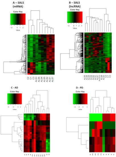 Expression profiles of differently expressed genes in SALS, AD, PD and healthy controls. In panel (A), SALS differentially expressed mRNAs are shown, while in panel (B) SALS differentially expressed lncRNAs are shown. 10 sALS and 3 CTRLs were used for this analysis. In panel (C) and (D) both mRNAs and lncRNAs DE respectively in AD and PD are shown, given the lower amount of DE genes. For both AD and PD heatmaps, 6 patients’ samples and 6 CTRLs were used. All comparisons are given between the disease state and the control samples. We considered as differentially expressed only genes showing |log2(disease sample/healthy donor)| ≥ 1 and a False Discovery Rate ≤ 0.1.