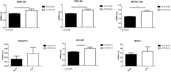 Differentially expressed transcripts verified by Real Time PCR in PBMCs from a larger cohort of SALS and CTRLs (N = 30 for lncRNAs and N = 10 for coding RNAs. * p < 0.05, ** p < 0.001 vs. CTR).