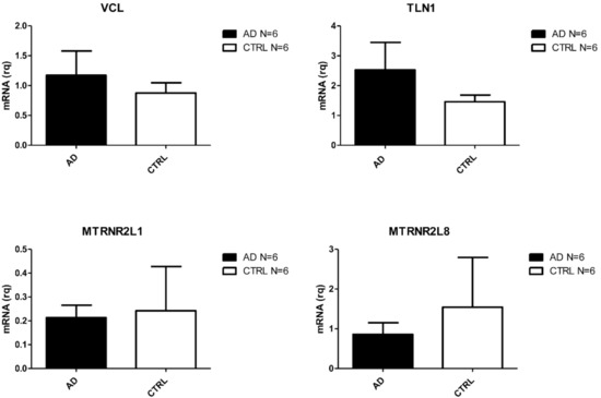 Amongst the most deregulated, we found coding genes already associated to AD such as TLN1 [33], and four nuclear pseudogenes (MTRNR2L6, MTRNR2L1, MTRNR2L10, and MTRNR2L8) of the mitochondrial MT-RNR2 gene [34]. VCL was also upregulated. This gene encodes for a protein involved in a pathway associated to Aβ toxicity [35] and associates to TLN1 [36].