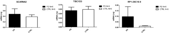 The crucial result that emerged from our RNA-seq analysis is the one concerning the small number of DE genes found in PD PBMCs. Despite the fact that an important deregulation of noncoding genes in CNS is observed [46], it has already been reported that, in peripheral blood, these RNAs are present but do not change their expression when compared to healthy controls [47,48]. In this group, we found the TBC1D3 gene to be downregulated. This transcript is not related to any PD molecular alteration, but it has been addressed as a promoter of the generation of basal neural progenitors and inductor of cortical folding in mice [38]. The only up-regulated gene was SCARNA2 (small Cajal body-specific RNA 2), a lincRNA which is independently transcribed [49]. Two other ncRNAs were found down-regulated, namely RP1-29C18.9 and RP1-29C18.8, but there is nothing reported in literature concerning their potential implication in PD.