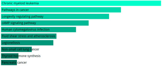 Pathways analysis performed with KEGG using DE genes in AD group compared to healthy controls. We report the top 10 KEGG terms. The significance of the specific gene-set term is represented by the length of the bar. The significance of the term is indicated by the brightness of the bar’s color (the brighter, the more significant).